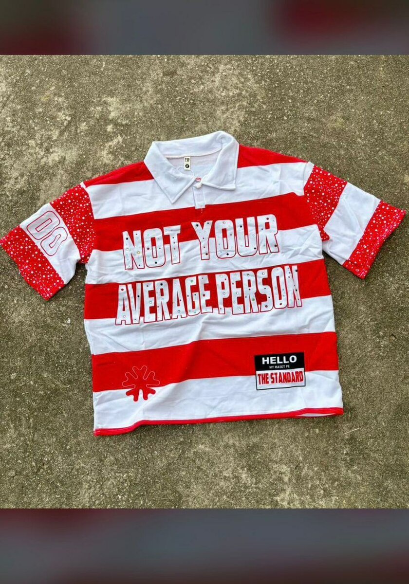 Polo homme rayé avec impression 'Not Your Average Person'. Disponible en rouge et bleu. Conçu pour les personnes uniques, il est idéal pour les occasions décontractées.