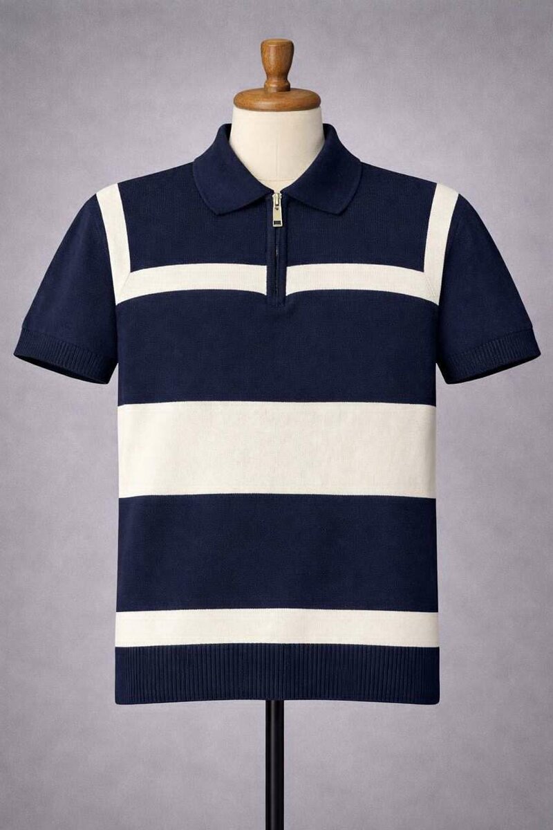 Polo homme en tricot, col à zip, rayures contrastées. Confortable et élégant, idéal pour les occasions décontractées. Disponible en différentes couleurs.