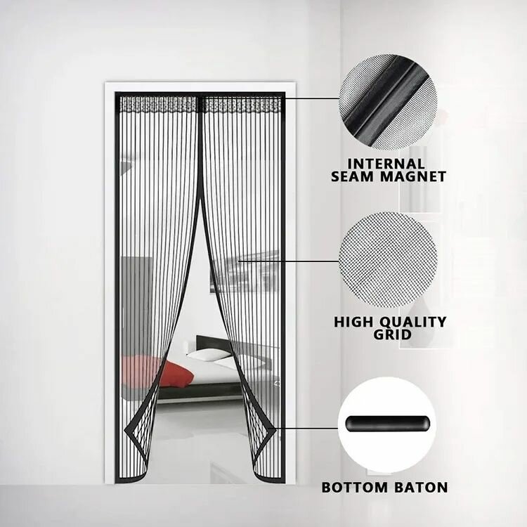 Keep your space insect-free without compromising airflow. This high-quality polyester curtain features a durable net grid, strong full-frame velcro for secure installation, and high-energy magnets that ensure smooth, automatic closure. Perfect for doors in homes, offices, or patios.