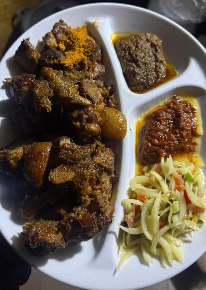 Porc Africain Braisé Assaisonné Aux Épices Du Cameroun + Attiéké LES PLATS SONT DISPONIBLES JUSQU'À 21HEURES