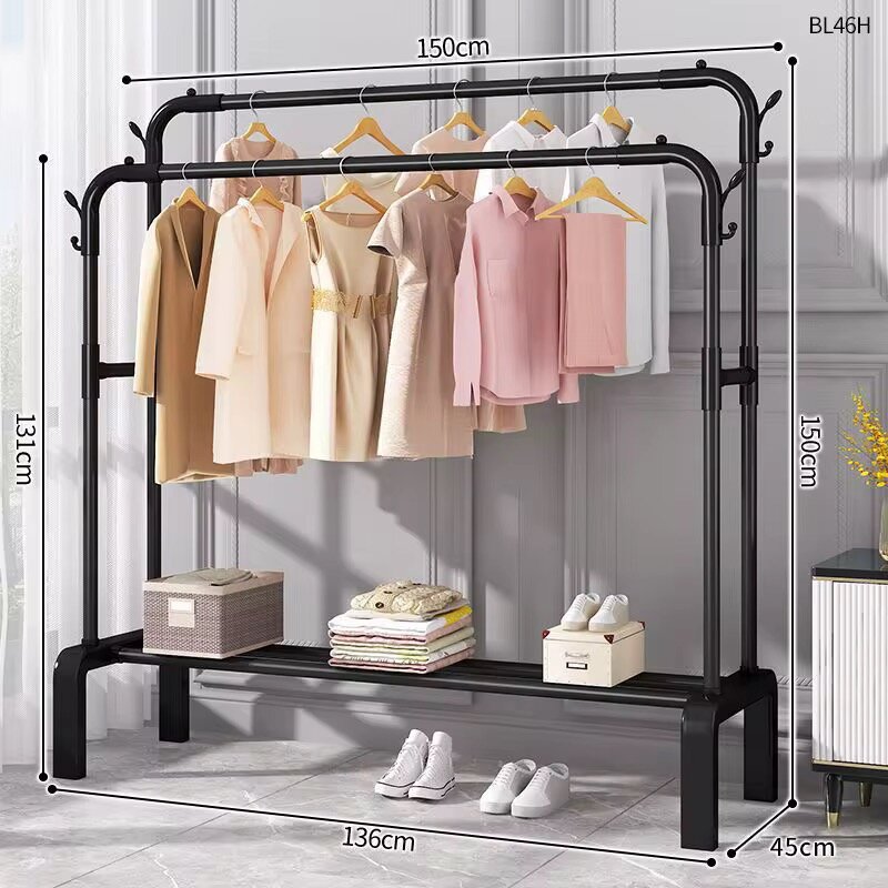 Optimisez votre espace avec ce portant à vêtements double robustesse en métal noir. Idéal pour organiser vos tenues, ses doubles barres permettent de suspendre vêtements, tandis que les étagères inférieures offrent un rangement supplémentaire pour chaussures et boîtes. Parfait pour la chambre ou le dressing!