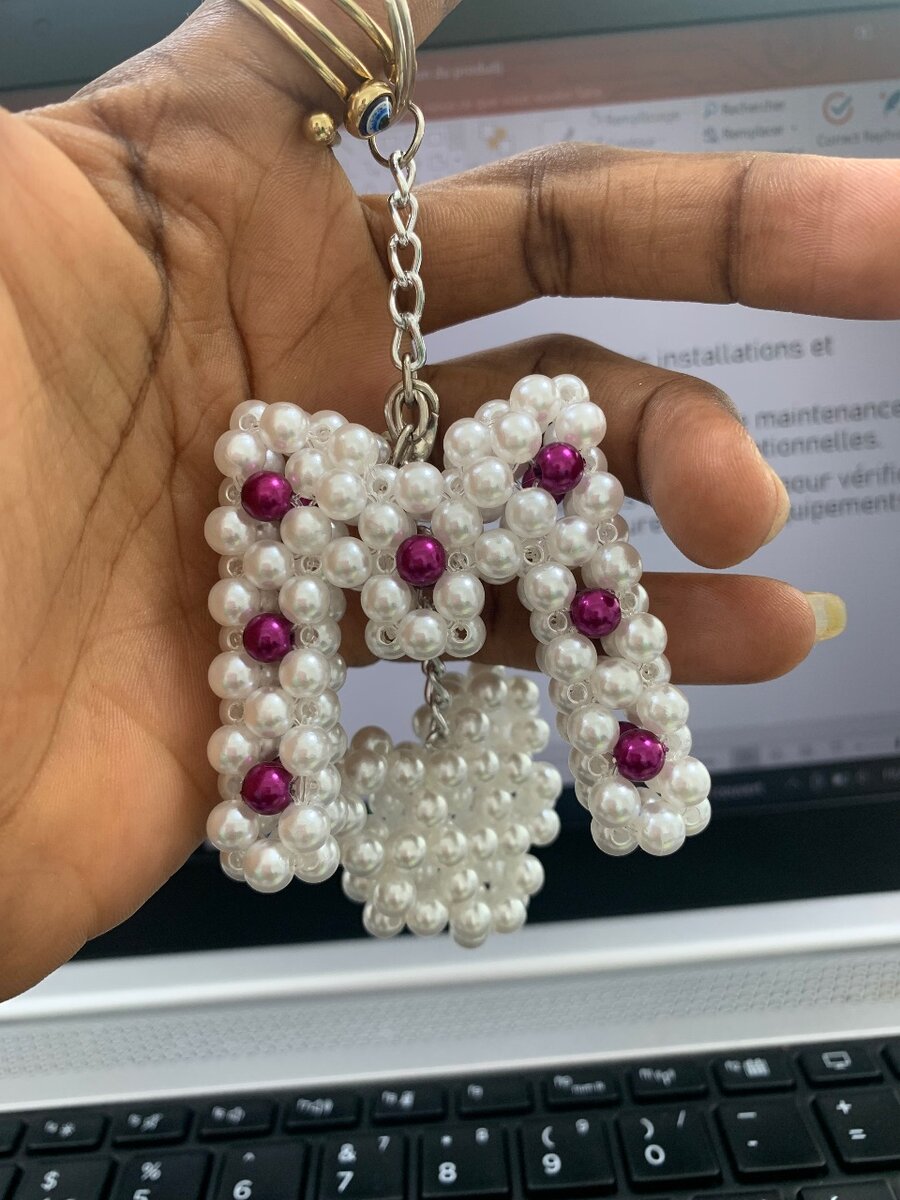 Ajoutez une touche étincelante à vos clés avec ce porte-clés perlé en forme de lettre M. Fabriqué avec des perles blanches et violettes, il est parfait pour personnaliser vos accessoires. Idéal comme cadeau pour amis ou famille !