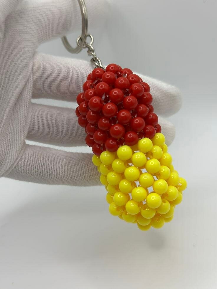 Ajoutez une touche de couleur à vos clés avec ce porte-clés fait main en perles rouges et jaunes. Idéal pour personnaliser vos sacs ou comme cadeau unique!
