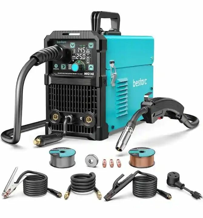 Poste à souder MIG Bestarc MIG145 pour soudure professionnelle avec écran LCD et réglages intuitifs. Livré avec accessoires complets pour un usage immédiat.