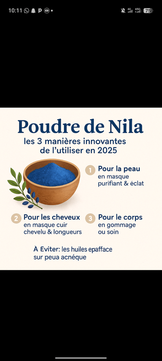 Unifiez votre teint et adoucissez votre peau avec la poudre de Nila Sahraouiya. Idéale pour le visage, les cheveux et le corps, elle réduit les taches brunes et hydrate intensément. Parfait pour une peau douce et rajeunie.