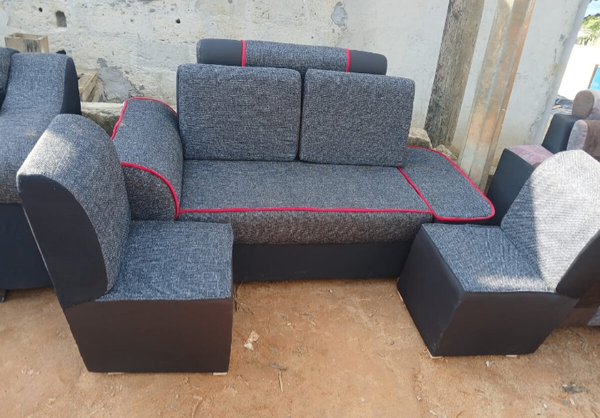 Ensemble canapé et fauteuils gris avec surpiqûres rouges