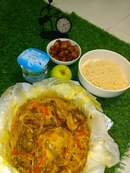 Savourez un repas délicieux avec notre poulet épicé mijoté à la perfection. Accompagné de couscous léger, pommes de terre dorées et une pomme fraîche pour une touche fruitée. Parfait pour un dîner gourmand et équilibré. Idéal pour les amateurs de cuisine épicée authentique.
