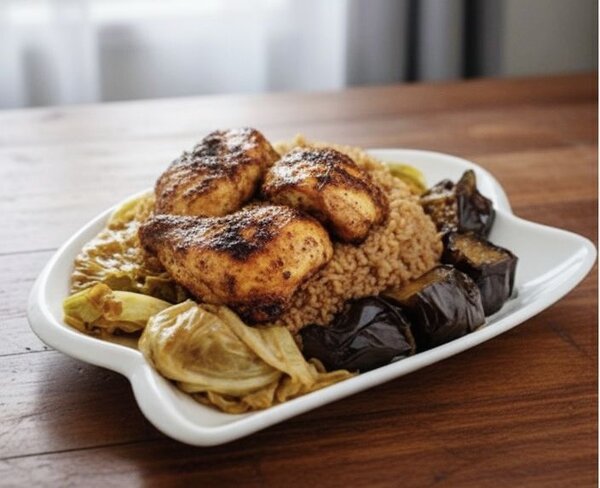 Savourez un délicieux plat de pattes de poulet, accompagné de légumes croquants et plantains dorés. Un plat parfait pour un repas équilibré et savoureux.