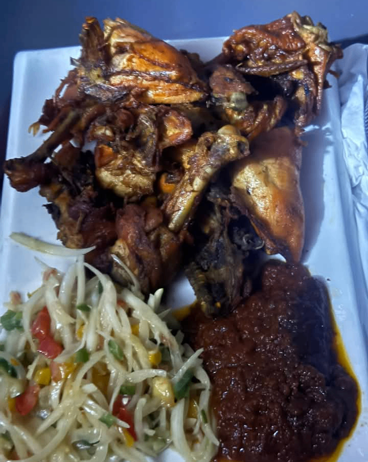 1/2 Poulet Frit Assaisonné Aux Épices Du Cameroun + Attiéké LES PLATS SONT DISPONIBLES JUSQU'À 21HEURES