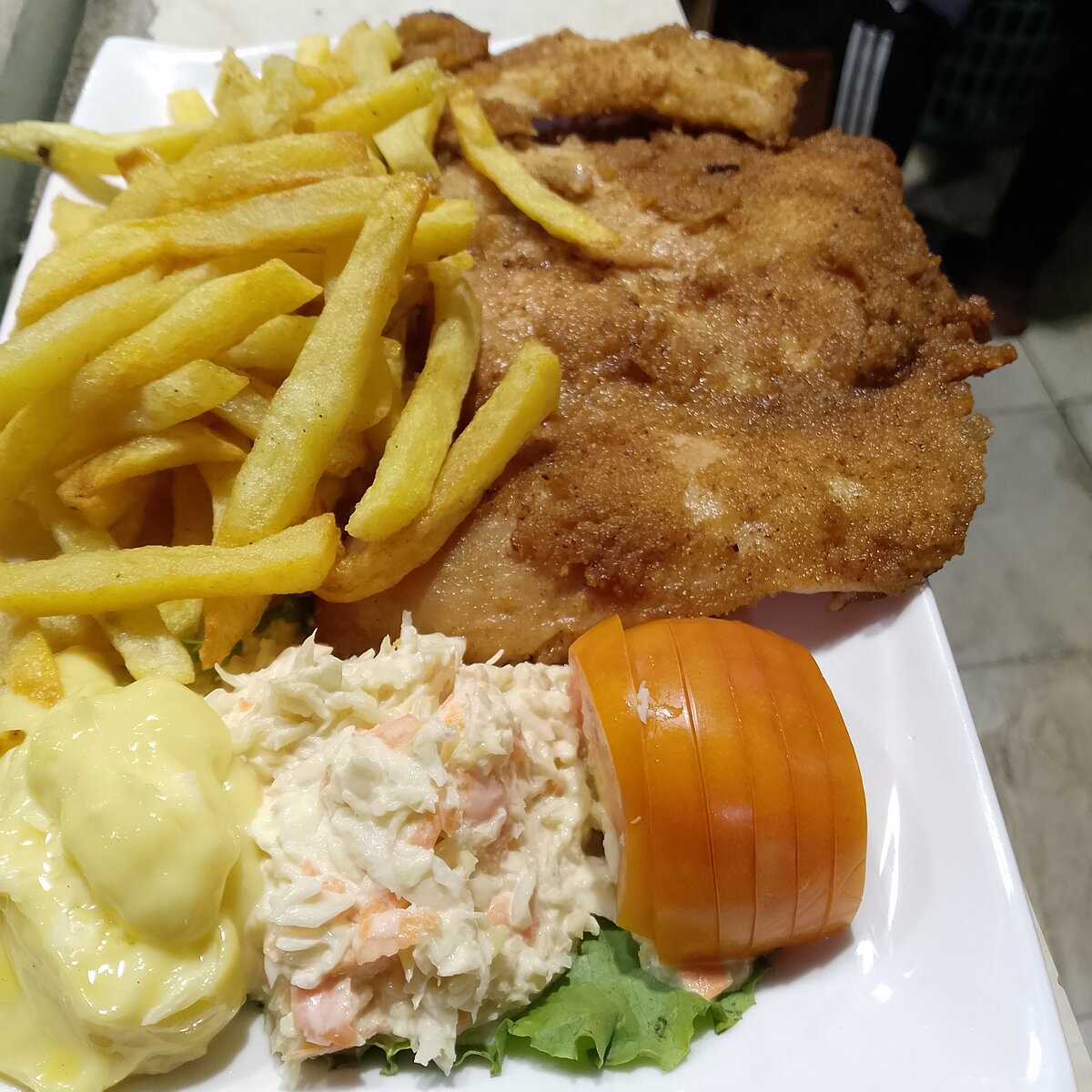 Dégustez notre délicieux poulet pané croustillant accompagné de frites dorées parfaites. Servi avec une salade de chou crémeuse et une sauce savoureuse, ce plat est idéal pour un dîner rapide et satisfaisant. Profitez de la fraîcheur des légumes pour une expérience complète. Parfait pour les amateurs poulet et de repas faits maison.