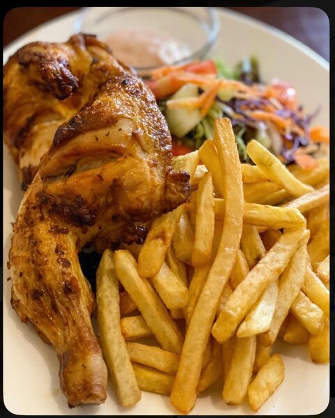 Savourez un délicieux poulet rôti accompagné de frites croustillantes, parfait pour un repas gourmand en famille ou entre amis. Prêt à satisfaire vos envies de saveurs authentiques et réconfortantes.