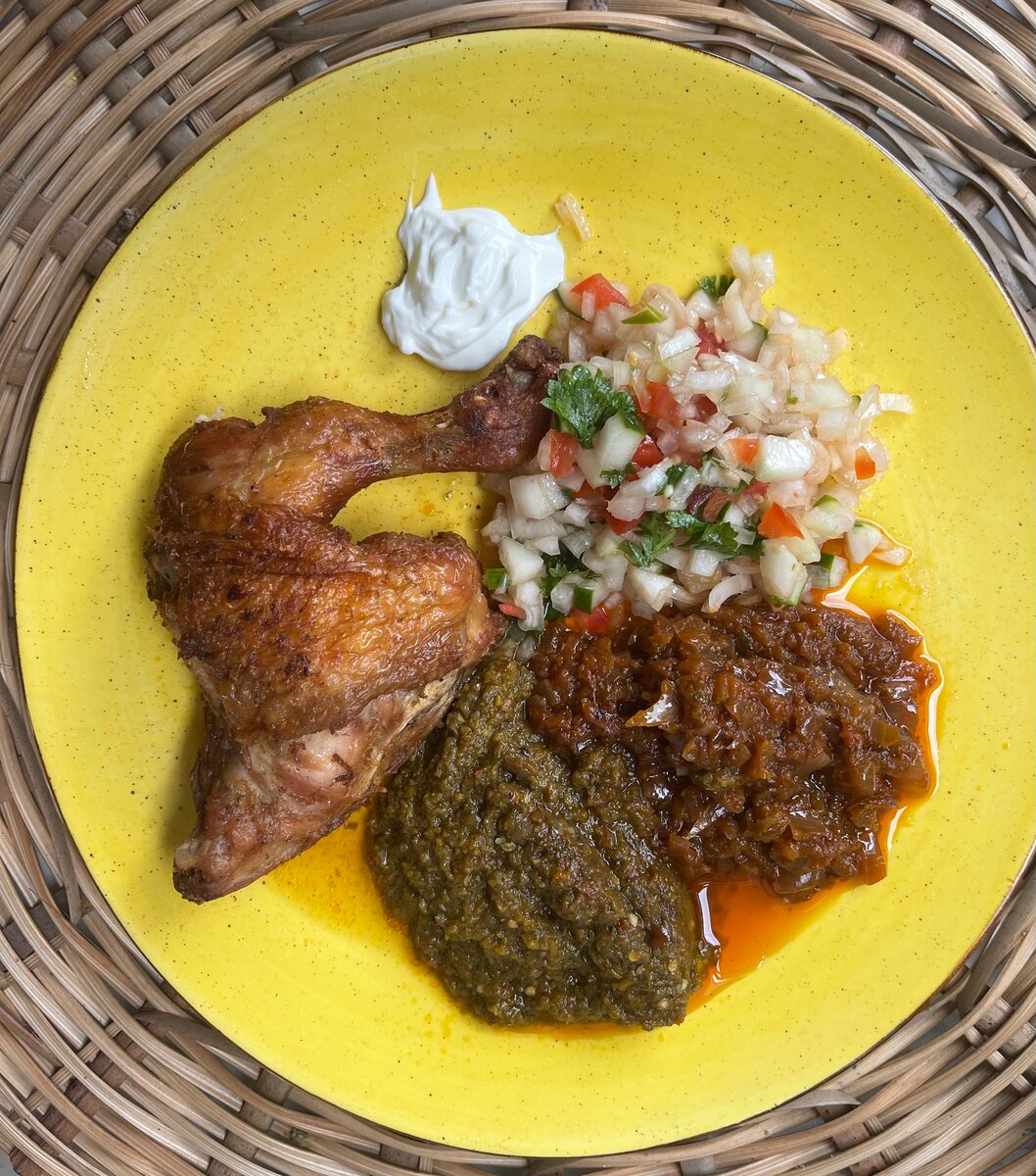 Découvrez notre délicieux poulet rôti épicé, accompagné de savoureuses sauces maison et d'une salade fraîche croustillante. Parfait pour un repas convivial et réconfortant. La combinaison unique d'épices et d'accompagnements rehausse le goût juteux du poulet. Idéal pour les amateurs de cuisine de qualité qui souhaitent apporter une touche exotique à leur table.
