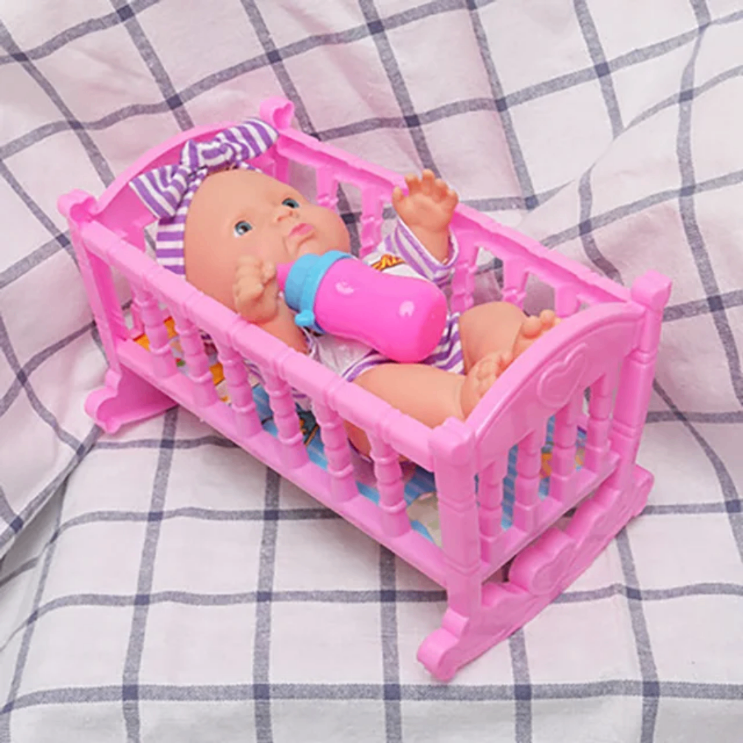Adorable poupon avec son berceau rose, idéal pour les jeux de rôle. Convient aux enfants pour développer l'imagination et les compétences sociales.