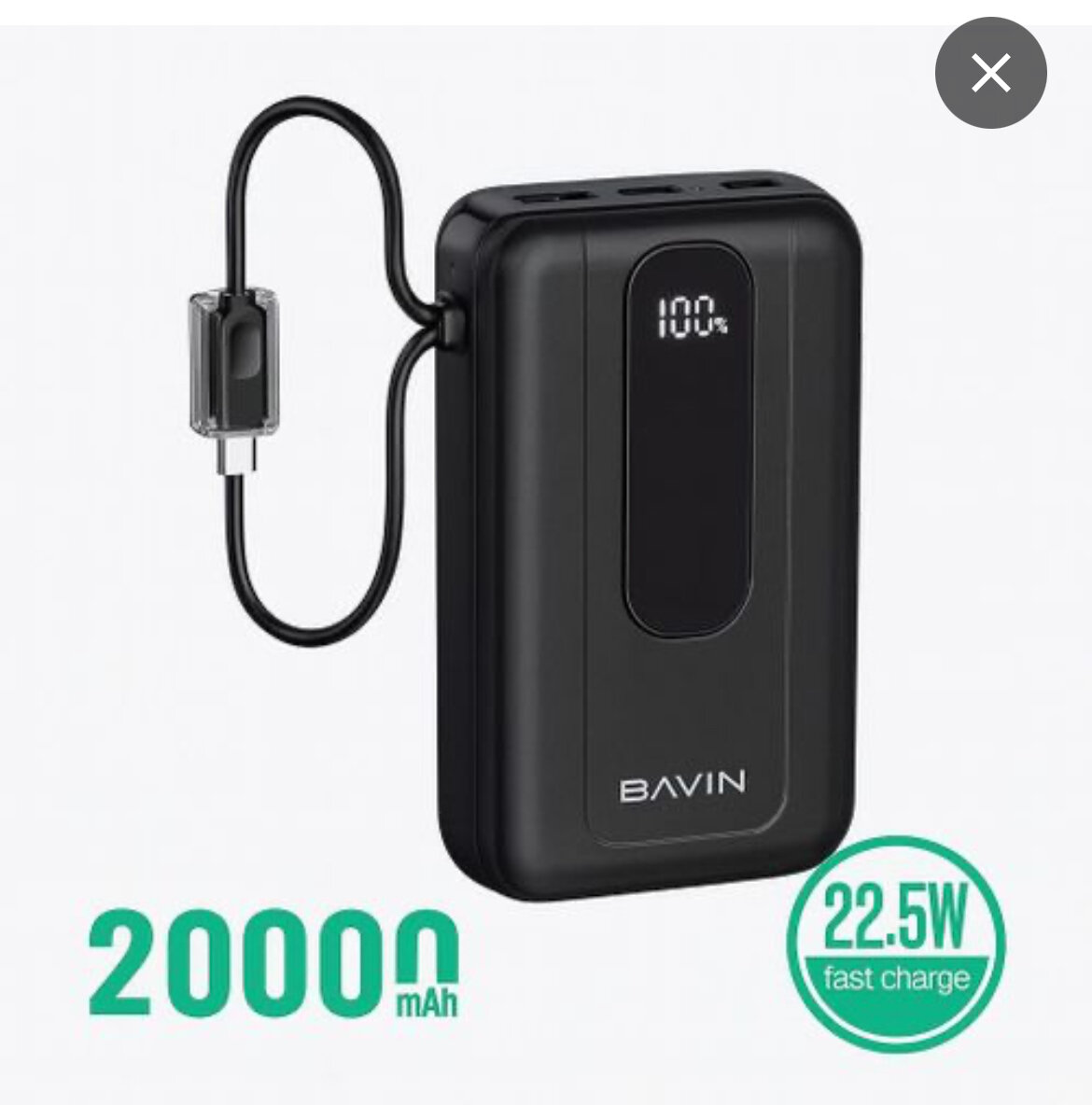 Batterie externe Bavin 20000mAh, recharge rapide 22.5W. Idéale pour recharger vos appareils en déplacement grâce à sa compatibilité USB-C. Compacte et efficace, elle est un choix parfait pour les voyages et les journées chargées.