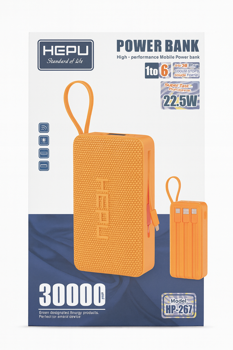 Profitez d'une autonomie prolongée avec ce power bank HEPU de 30000mAh. Idéal pour recharger vos appareils en déplacement, il est compact et pratique avec sa capacité haute performance de 22.5W. Compatible avec plusieurs appareils, c'est l'accessoire parfait pour vos voyages ou votre usage quotidien