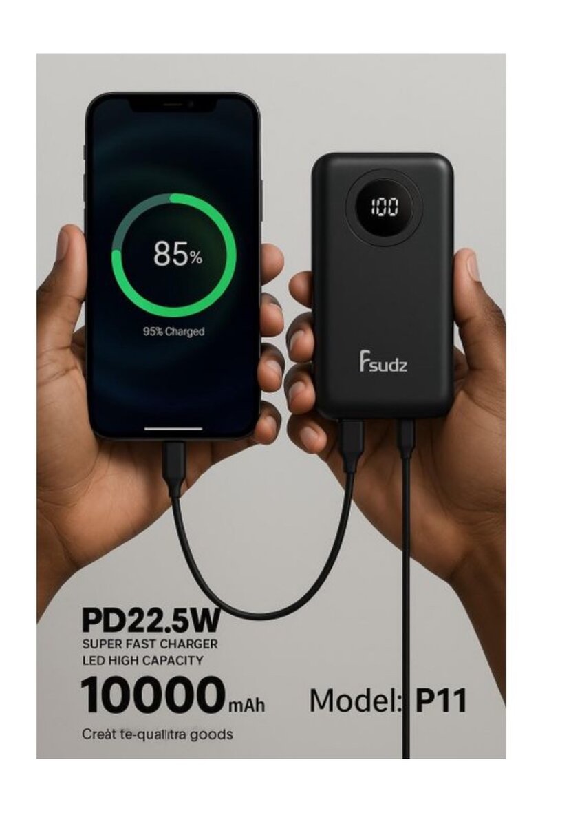 Power Bank Fsudz P11 avec charge ultra-rapide 22.5W et capacité de 10000mAh. Idéal pour recharger vos appareils en déplacement avec son affichage LED pratique. Compact et efficace, parfait pour les voyages ou l'utilisation quotidienne.