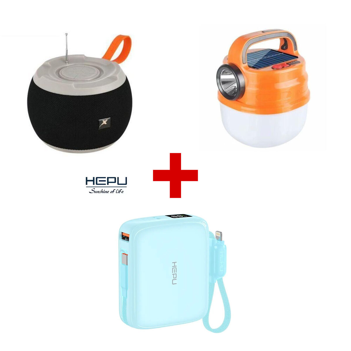 Cet ensemble inclut un haut-parleur portable Hi-Fi, une lampe solaire LED pour l'extérieur, et une powerbank HEPU 10000mAh compacte. Parfait pour les aventures, cet équipement est indispensable pour profiter de la musique, de l'éclairage et garder vos appareils chargés lors de vos déplacements. Idéal pour le camping, les voyages et les activités en plein air.
