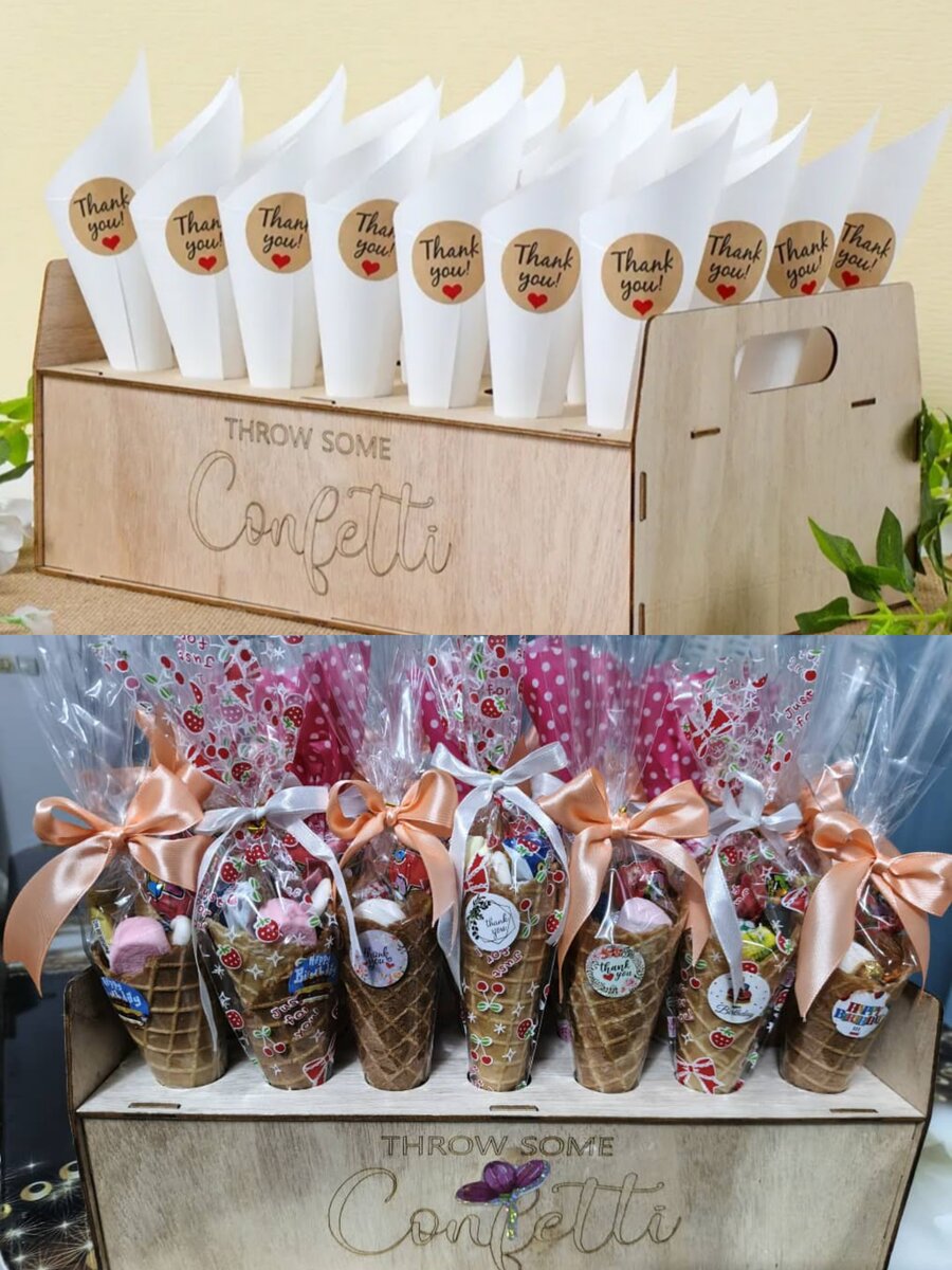 Idéal pour mariages, fêtes d'anniversaire, d'école, de baptême.... Ce présentoir élégant avec cornets en papier sans confettis est là pour ajouter une touche charmante à votre événement. Facile à assembler, il est également réutilisable pour toutes vos célébrations futures.