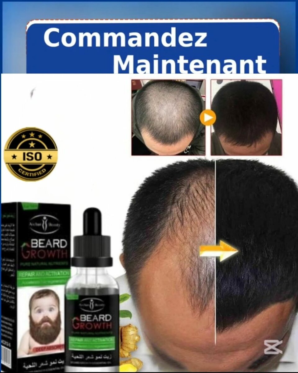 Redonnez vie à vos cheveux et à votre barbe avec notre huile de croissance 100 % naturelle enrichie en gingembre et extraits de plantes puissants. Formulée pour stimuler les follicules dormants, elle favorise une repousse rapide des cheveux et de la barbe, tout en renforçant la densité et léclat naturel. Convient aux hommes et aux femmes souffrant de calvitie, de chutes de cheveux ou de zones dégarnies.