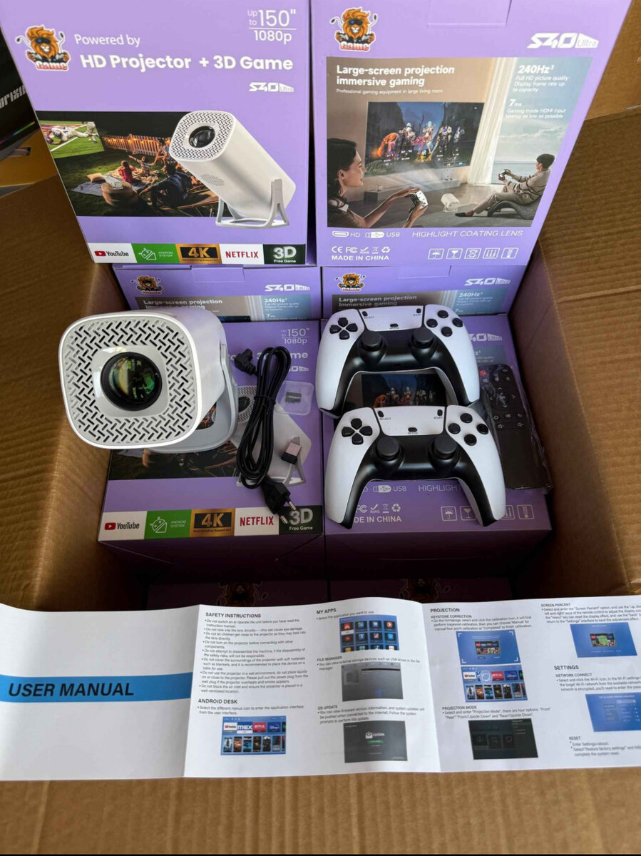 Projecteur HD 1080p avec jeu 3D et manette de jeu. Idéal pour les amateurs de jeux vidéo et de cinéma à domicile. Technologie 4K et 3D pour une expérience visuelle immersive.