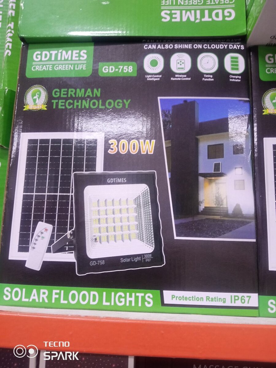 Illuminez votre extérieur avec ce projecteur solaire de 300W, résistant à l'eau (IP67). Idéal pour les jardins, allées et patios, il fonctionne même par temps nuageux. Pratique avec télécommande incluse pour régler à distance.