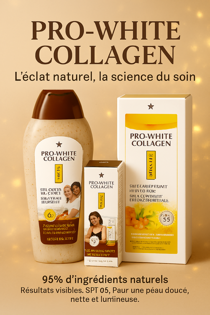 Découvrez Pro-White Collagen, la science du soin au naturel. Avec 95% d'ingrédients naturels, faites briller votre peau en douceur avec des résultats visibles. Idéal pour une routine beauté lumineuse et éclatante.
