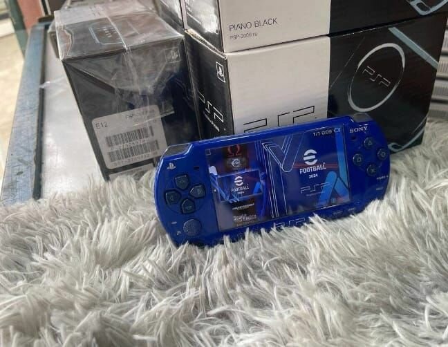 Console de jeu portable Sony PSP en bleu translucide. Parfait pour jouer à vos jeux favoris en déplacement. Comprend des contrôles complets et un écran clair.