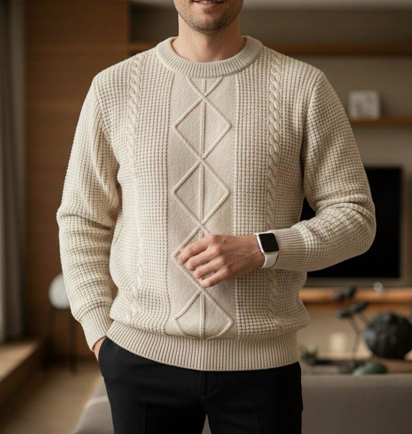 Pull homme moderne et élégant, tricoté avec des motifs géométriques et des couleurs neutres. Conçu pour un usage quotidien, confortable et résistant.