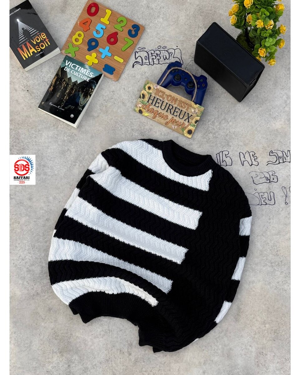 Ajoutez une touche contemporaine à votre garde-robe avec ce pull rayé en tricot. Idéal pour un look décontracté ou chic, ce pull est doux et confortable. Parfait pour les journées fraîches, il s'associe bien avec un jean ou une jupe. Un incontournable polyvalent pour toutes les saisons.