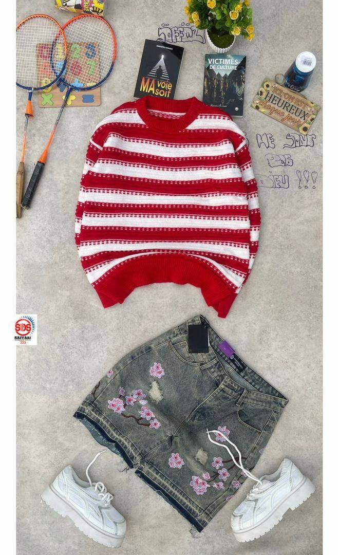 Ce pull rayé rouge et blanc est parfait pour un look décontracté et tendance. Confortable et élégant, il se marie bien avec un short en jean pour une sortie. Idéal pour l'automne ou le printemps, son design polyvalent conviendra à toutes vos tenues décontractées. Portez-le pour une promenade en ville ou une journée entre amis !