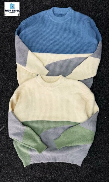 2 pulls à blocs couleurs femme, haut bleu/gris/blanc, bas vert/noir/ivoire. Maille douce et confortable. Chaque pièce à 12 000 XOF.