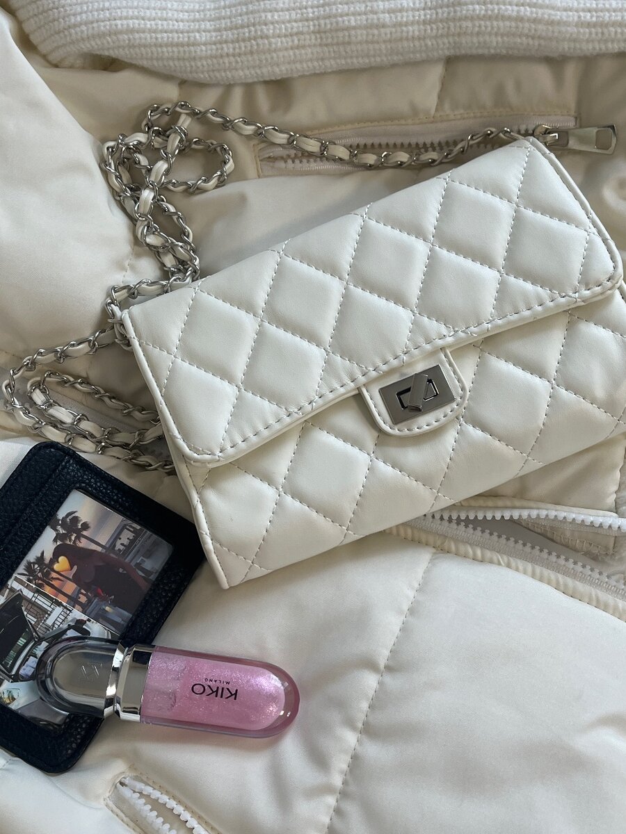 Стильная и удобная сумка Цвет: Белый Размер: 19*13*4 Внутри: 2 раздела в красном цвете В комплекте идёт длинная цепь.