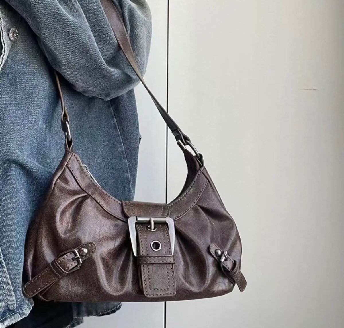 Сумка выполнена в стиле хобо с элементами классического дизайна и акцентами, характерными для Y2K-эстетики. Она имеет компактную, слегка структурированную форму с мягкими складками, что добавляет изделию элегантности и расслабленного шарма.