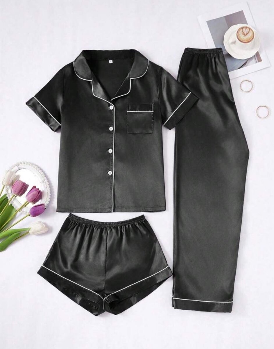 Découvrez l'élégance et le confort de notre pyjama en satin pour femme. Offrant une sensation douce et luxueuse, il inclut un pantalon, un short et un haut boutonné, idéal pour le repos. Parfait pour les nuits douillettes à la maison ou pour un cadeau raffiné. Disponible en plusieurs couleurs pour s'adapter à tous les styles.