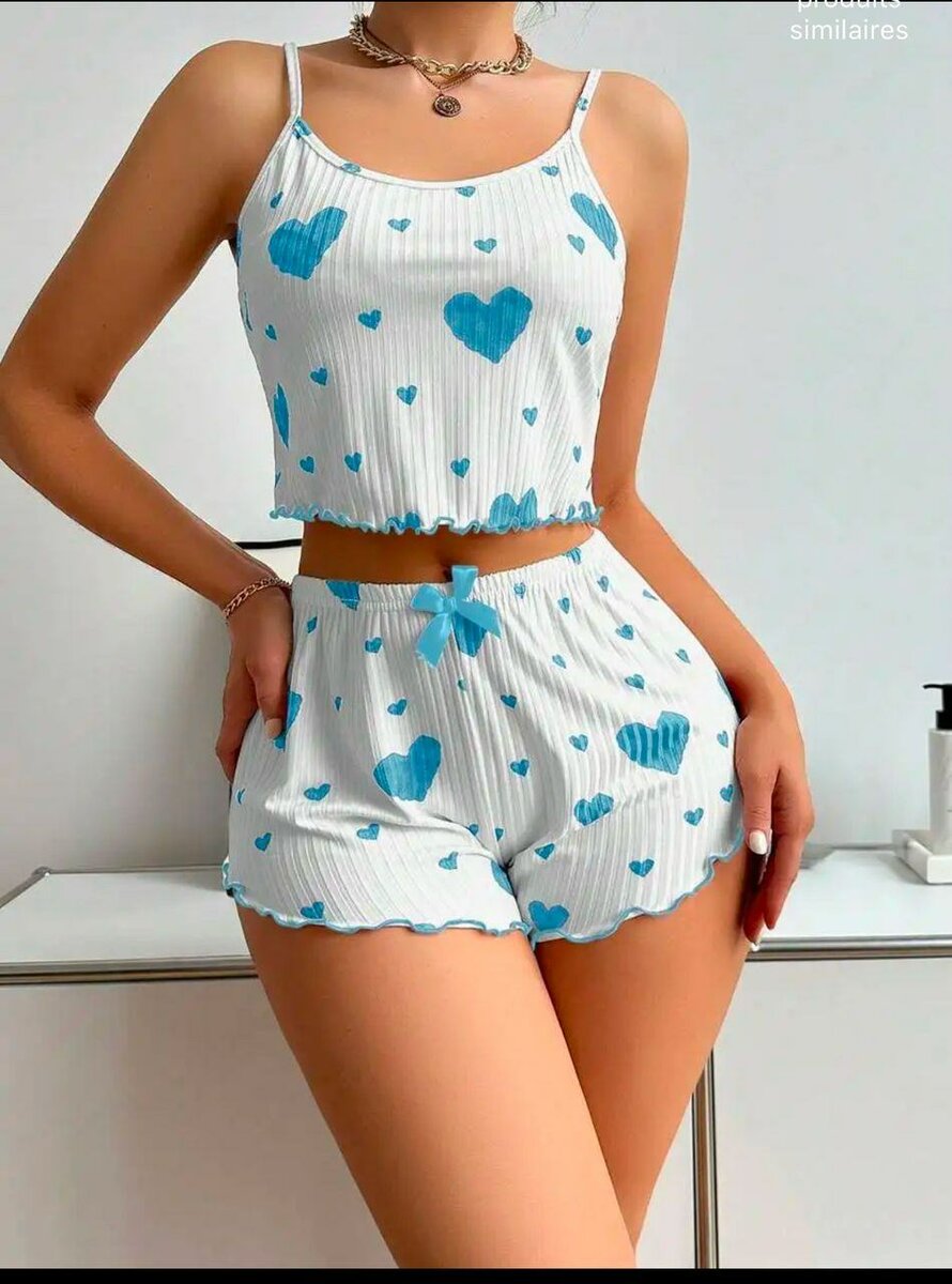 Ensemble pyjama féminin avec motif cœur. Confortable pour des nuits paisibles, doux et respirant. Idéal pour un cadeau romantique ou pour se détendre à la maison. Disponible en plusieurs couleurs.