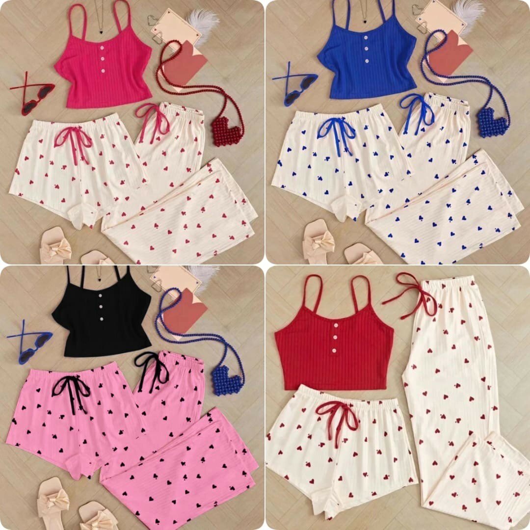 Collection de pyjamas légers pour femme avec motifs cœurs, parfaits pour des nuits douillettes. Disponible en plusieurs couleurs vives avec un haut à boutons élégant. Idéal pour la détente à la maison.
