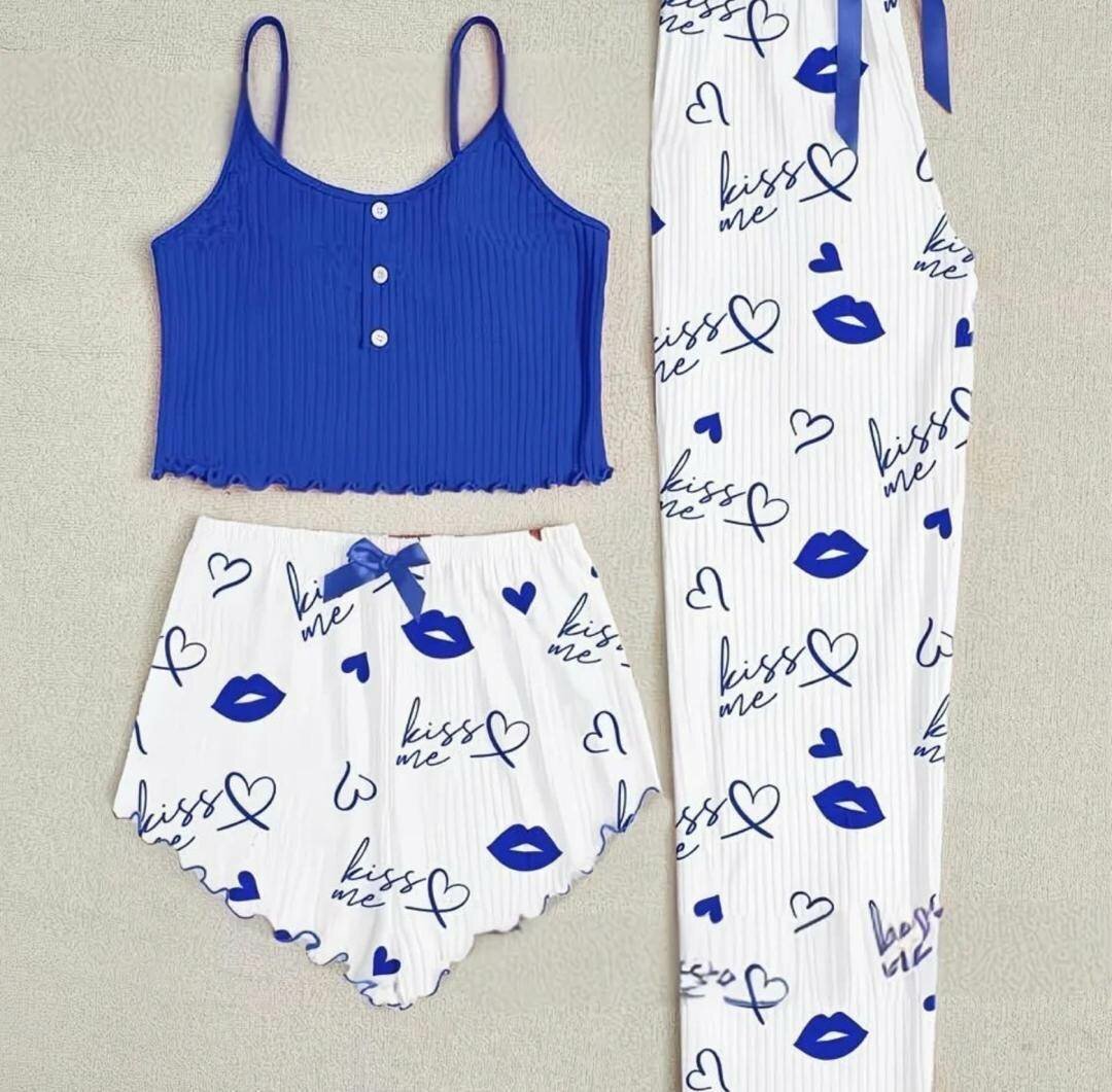 Découvrez le pyjama "Kiss Me" : une tenue de nuit chic et confortable. Comprend un haut bleu vif, un short et un pantalon à imprimé moderne. Idéal pour des soirées cocooning.