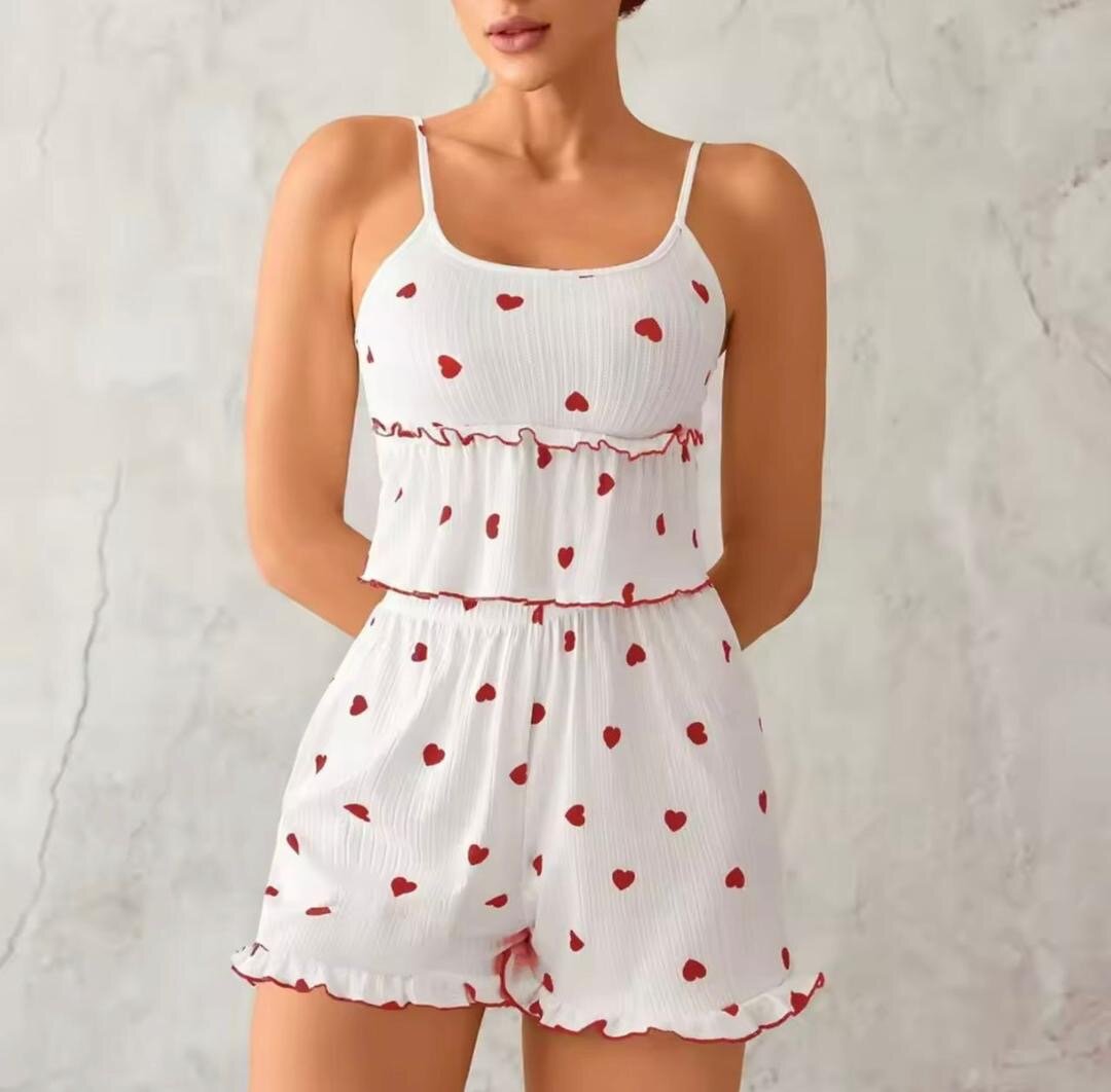 Ce pyjama féminin avec motif cœur est parfait pour des nuits confortables. Fabriqué en tissu doux et respirant, il offre une coupe ample avec bretelles fines, idéale pour dormir ou se détendre à la maison. Un choix parfait pour celles qui aiment le style et le confort.