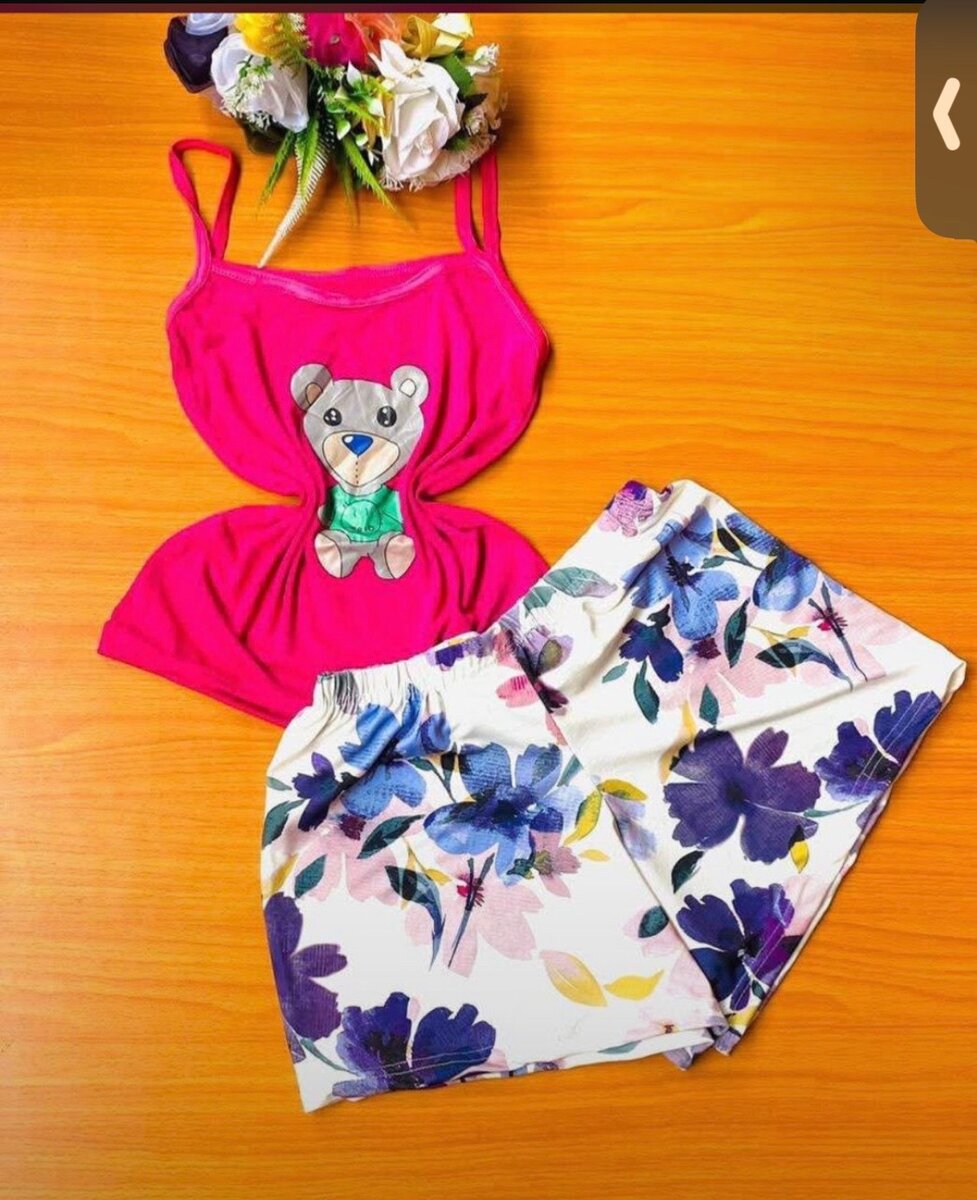 Pyjama adorable pour grande personne avec un haut ourson et short floral. Confortable et parfait pour les nuits.