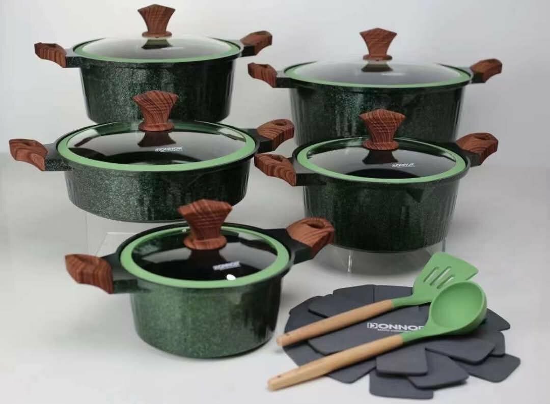 11 pieces granite non stick cookware available in emerald green as seen in the picture