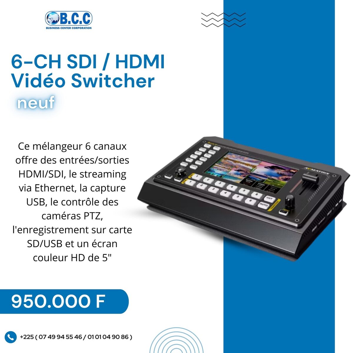 Le commutateur vidéo HDMI/SDI 6 canaux Shark S6 d' AVMATRIX dispose d'une entrée/sortie HDMI/SDI 6 canaux et peut diffuser via Ethernet, capturer et se connecter à des applications de conférence informatique via USB, contrôle de caméra PTZ, carte SD et enregistrement USB, transitions, effets, mixage audio, incrustation et dispose d'un écran couleur HD 5".