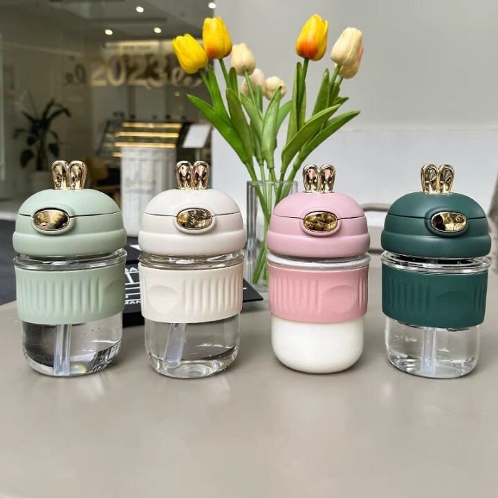 Portable Bunny Ear Flip Top Straw Glass Tumbler with Silicone Sleeve