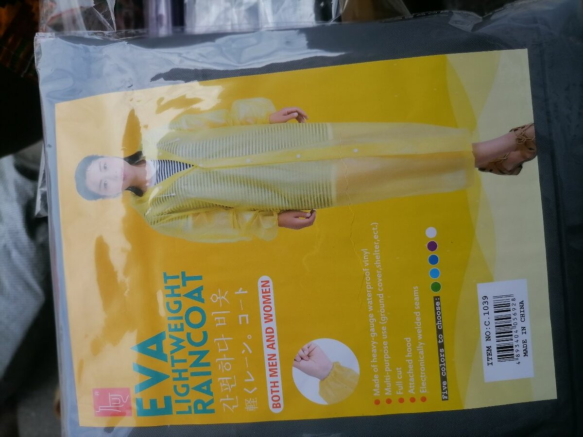 Raincoat with cap. Can be buttomed down. Waterproof different colors available