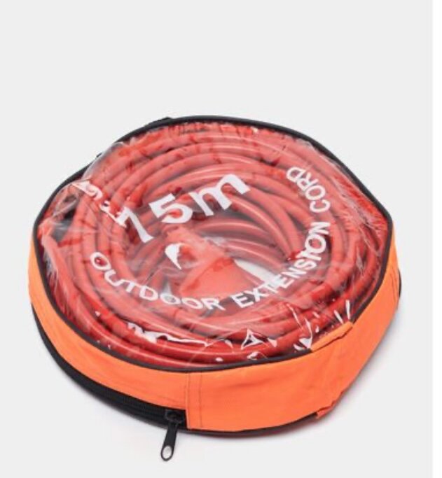 Rallonge électrique extérieure 15m enroulée dans un sac orange. Idéale pour les travaux extérieurs, le camping et les activités de plein air. Résistante aux intempéries.
