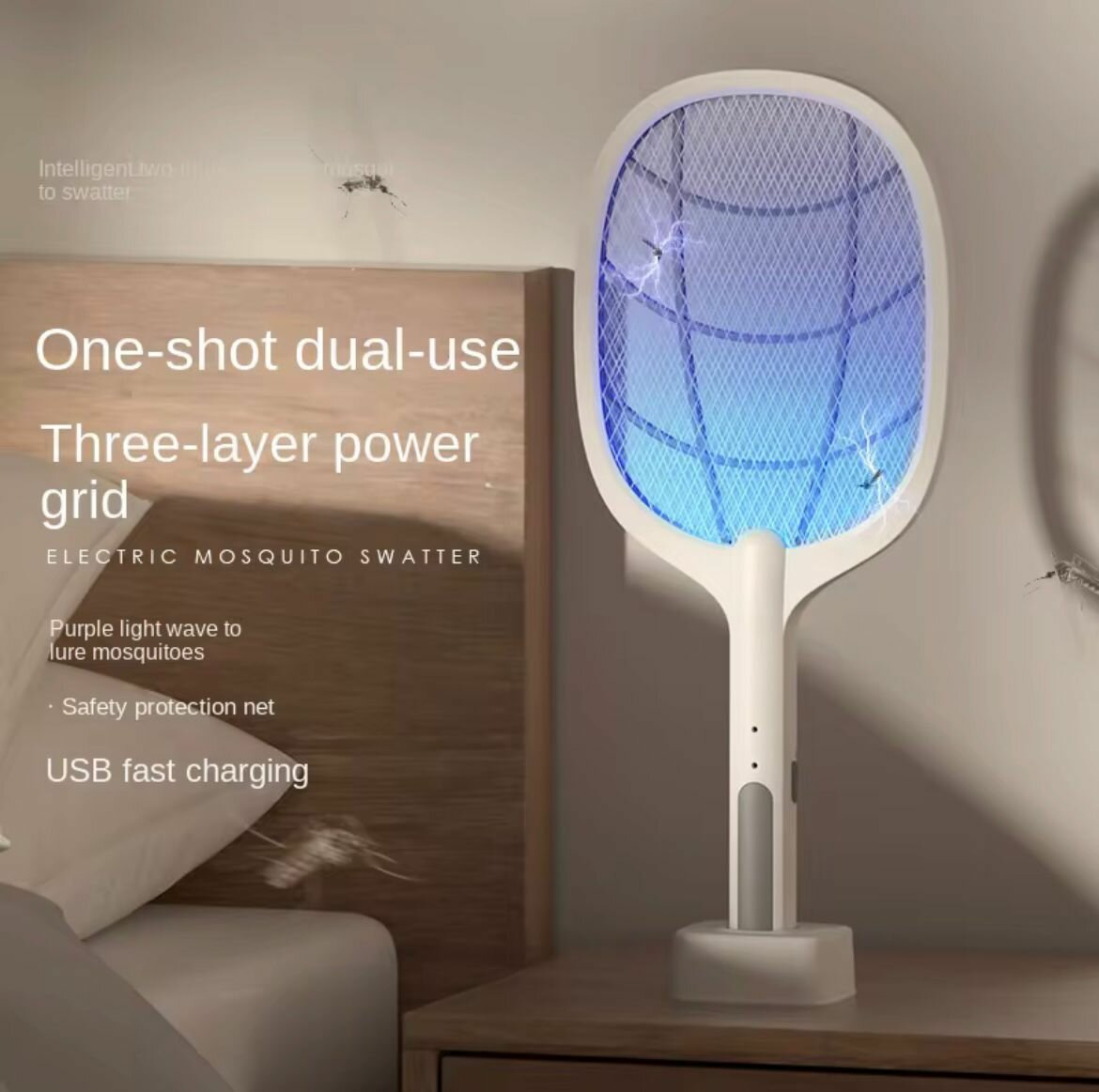 Éliminez les moustiques efficacement avec cette raquette électrique dotée d'une grille à trois couches et lumière violette. Recharge rapide USB et base stable pour un accès facile. Idéale pour la maison ou le jardin.