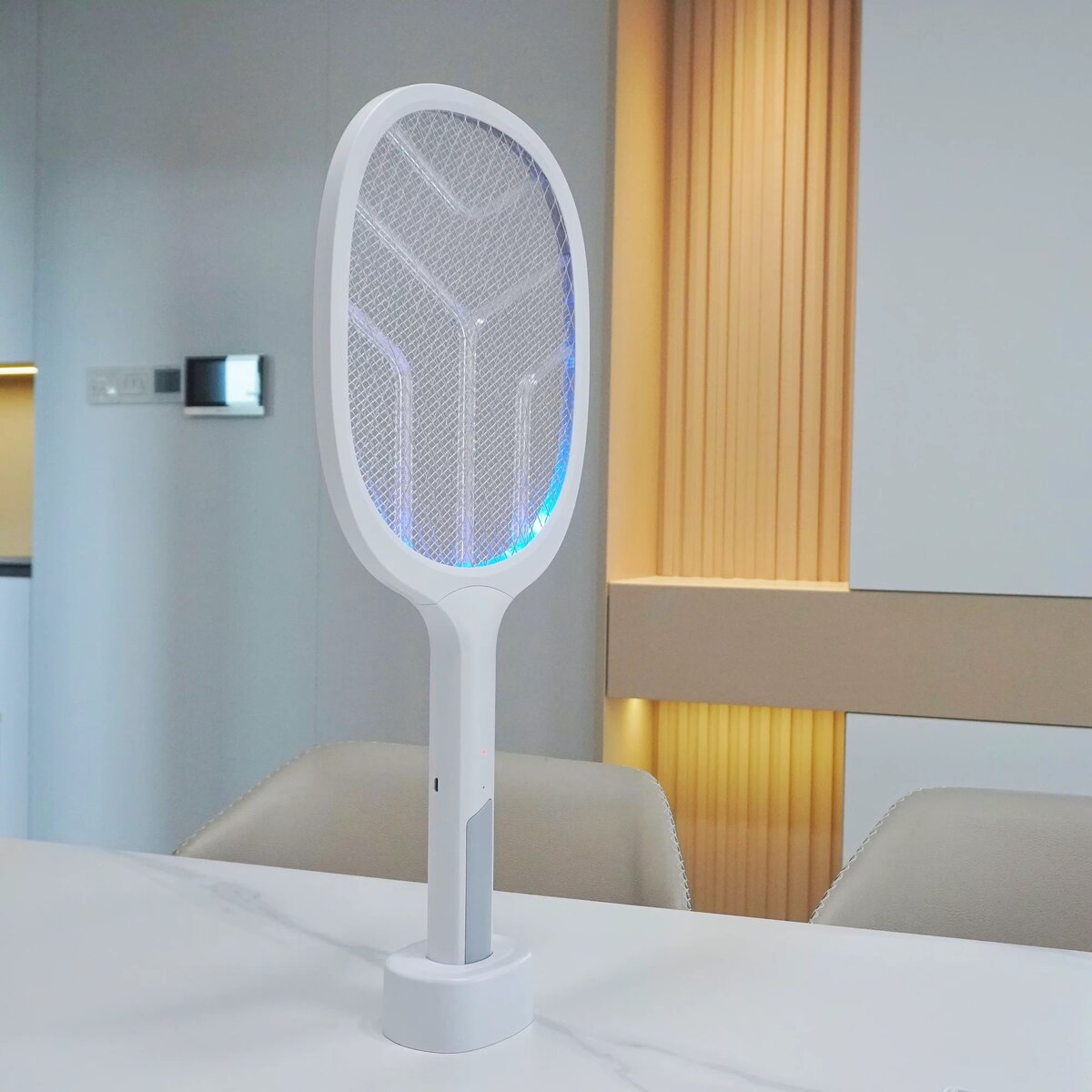 Éliminez les insectes facilement avec cette raquette électrique. Idéale pour la maison, elle est équipée d'une base rechargeable et d'une lumière LED pour une efficacité accrue. Parfaite pour les soirées d'été.
