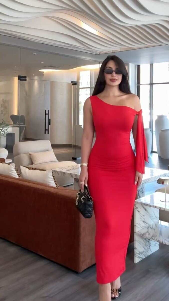 Elevate your evening style with this sleek red off-the-shoulder bodycon dress. Perfect for formal events or a night out, this fitted dress combines elegance and modern design. The unique off-the-shoulder detail with a hanging sleeve adds a touch of sophistication.