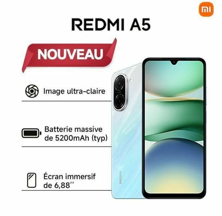 Découvrez le Redmi A5, smartphone avec écran immersif de 6,88'' et batterie massive de 5200mAh. Profitez d'images ultra-claires avec sa caméra avancée. Idéal pour un usage quotidien.
