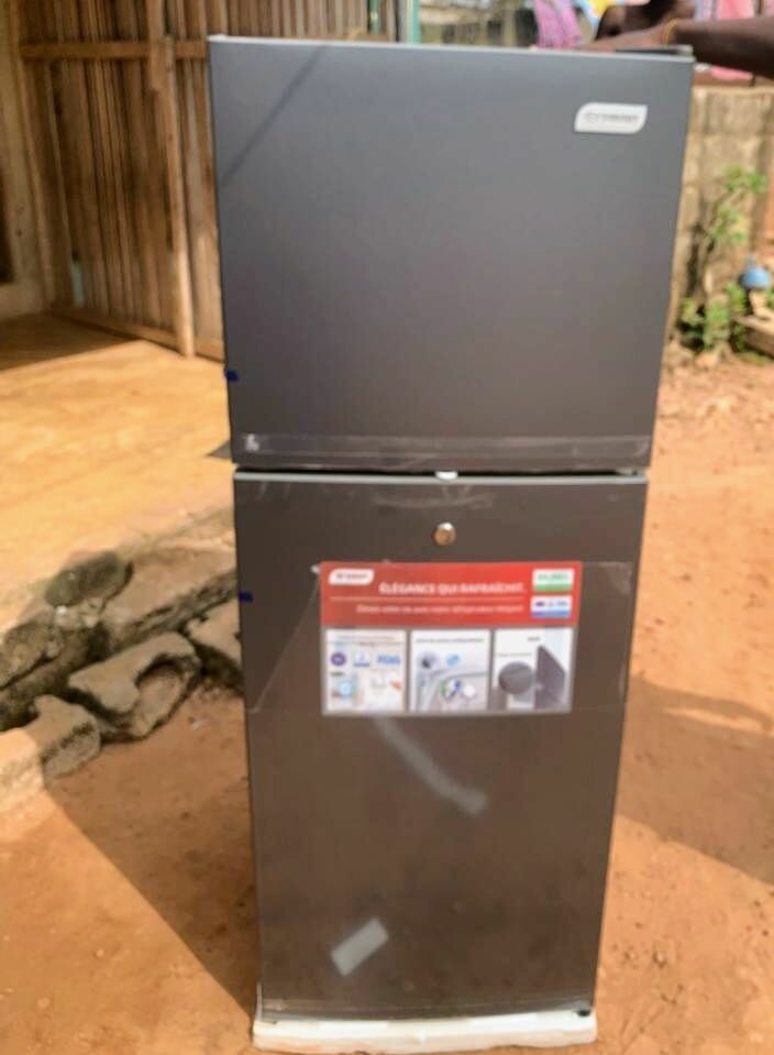 Réfrigérateur compact à 2 portes avec congélateur, intérieur blanc, design moderne. Idéal pour la cuisine, facile à utiliser et à entretenir.