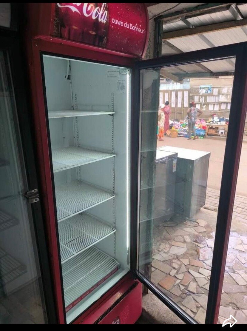 Réfrigérateur de boissons Coca-Cola, idéal pour les commerces. Intérieur propre, étagères ajustables. Robuste et efficace.